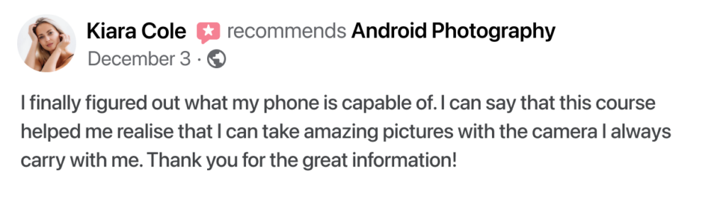 And the great news is that you don’t need prior experience. Moreover, you’ll save 10 precious years of your life – years of struggling, reading, comparing, and trying to accomplish something that can be mastered in no time with the right approach. Most students of Mobile Photography see instant improvements!
