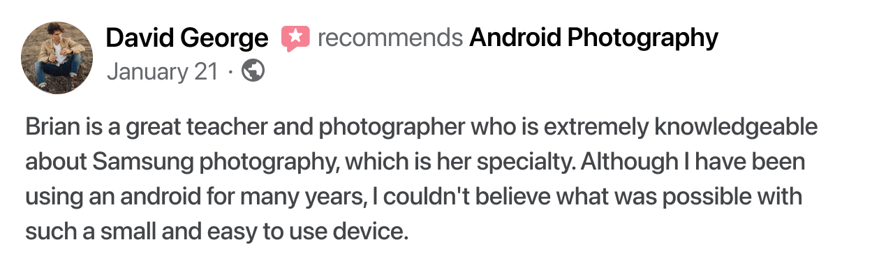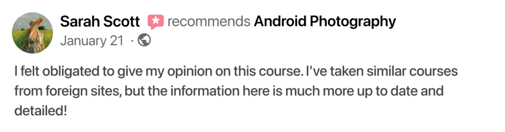 It’s one of the finest investments I’ve made in recent years. When I hold a mobile device, I know I have a professional camera that can do practically everything. I appreciate the course. I’ve subscribed and look forward to the next course.